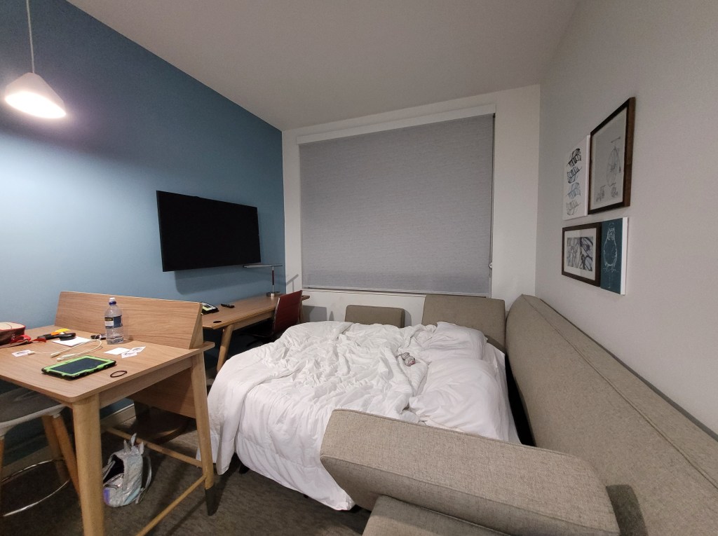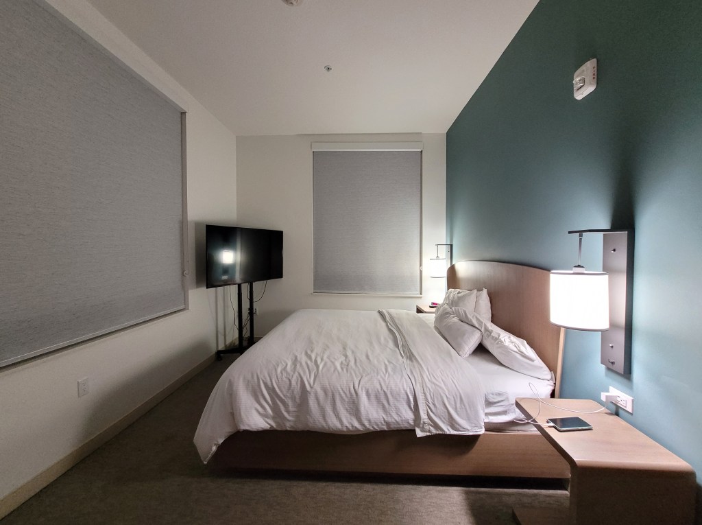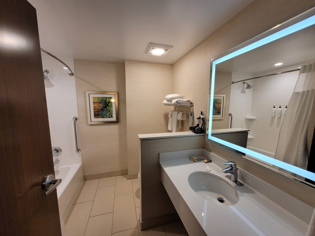For our September trip, we stayed at the Elements Edmonton West. We were upgraded to a slightly nicer suite; this had a separate sleeping area with a king-sized bed and a pullout couch in the living room for the kids. It also had a small kitchenette with everything you needed to cook your own meals. Breakfast is included here along with free parking. The bathroom was nice, and the hotel overall is newer, with an attractive modern finish. We had a safe, comfortable place to spend the weekend, although sleep quality and bed comfort left a lot to be desired.