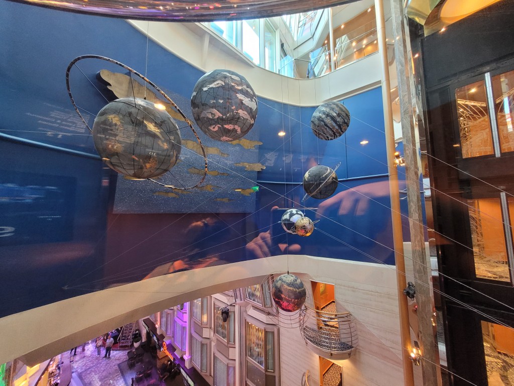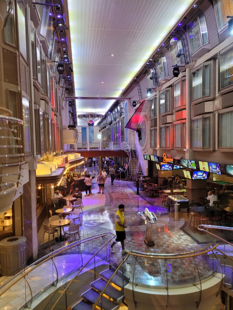 There is also an arcade, but in my mind it’s a bit useless as it costs extra and, just, why would you want to pay for an arcade on a cruise ship? I don’t know how much RCCL gains in revenue from it, but we often saw it sitting empty. Lower down, the Royal Promenade featured the shopping district for the ship, filled with duty-free shops, a neat retro car, and evening performances. The evening performance we watched was fun and the kids enjoyed dancing along.