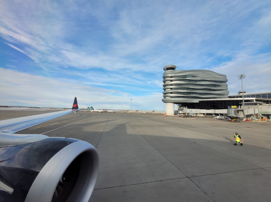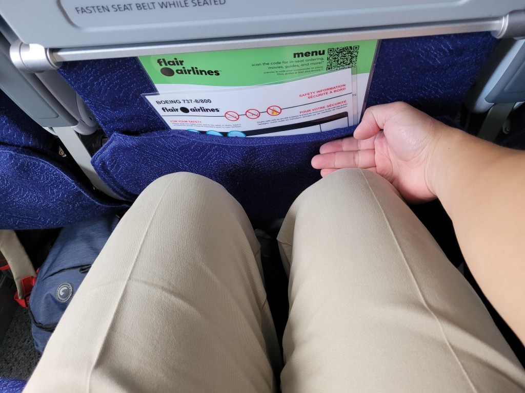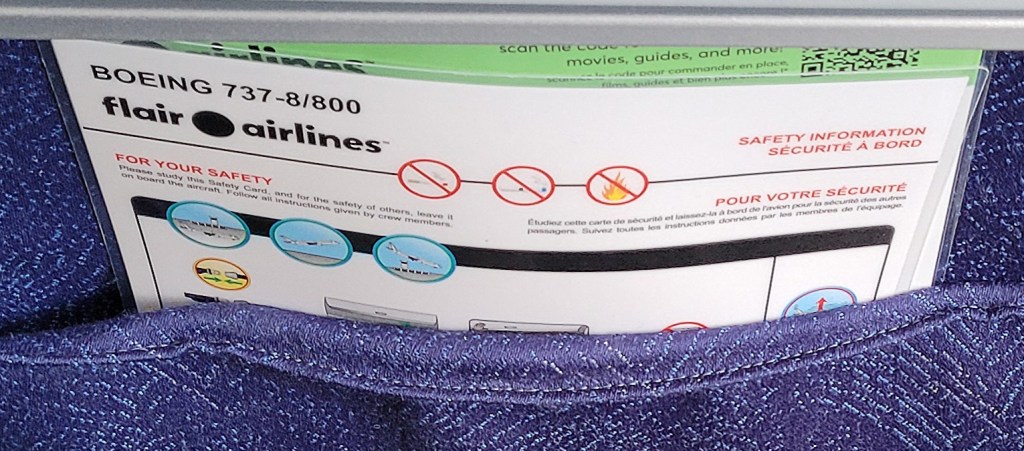 When boarding a Flair flight, you’re greeted with a 189-seat all economy layout. Interestingly, there are extra-legroom seats down just the right side of the first 9 or so rows, but on the left it is standard legroom seats. Not sure why the cabin was laid out this way, nothing wrong but it’s just odd the rows end up offset. The seats are upholstered in a comfortable blue fabric that I much prefer over the leather on WS. The seats have surprisingly good legroom from a ULCC, an unexpected fact that made the flight to 5hr Ottawa more comfortable.