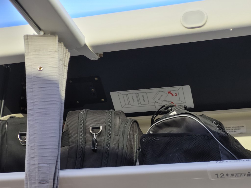 You’ll notice there are no headrests, and the seats do not recline at all. While the Flair aircraft have the Boeing Sky Interior and the overhead lockers look the same, they are shorter and fit only what previous gen bins fit, roller bags flipped sideways will rotate, prevent the bin from closing.