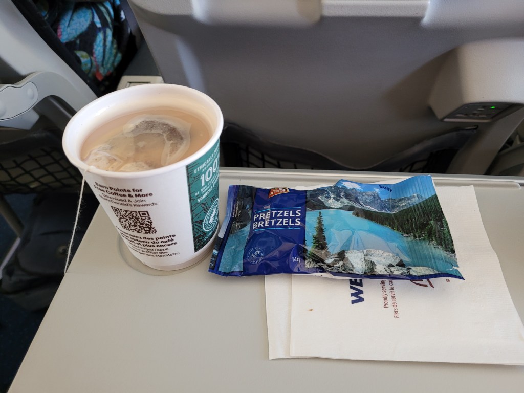 WS comes around with a buy on board service along with a drink service. I appreciate being able to have a few teas to choose from, or just getting a gingerale with a snack. I have found the buy on board to be quite inconsistent, but our flight lengths usually mean I easily survive without anything substantial. On our flight from Vancouver to Cancun though, only a beverage service was available with no buy on board at all, a 6-hour flight with soda and pretzels.
