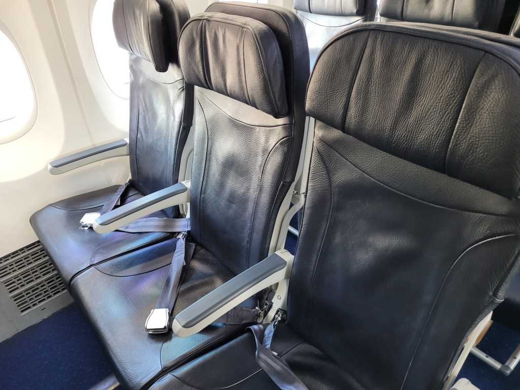 The seats are upholstered in leather (pleather?) and have adequate legroom for the segments they fly, but for those who want a bit more, the first few rows are extra legroom seats that can be selected in advance for a fee. There are adjustable headrests and the seats recline about 3inches.