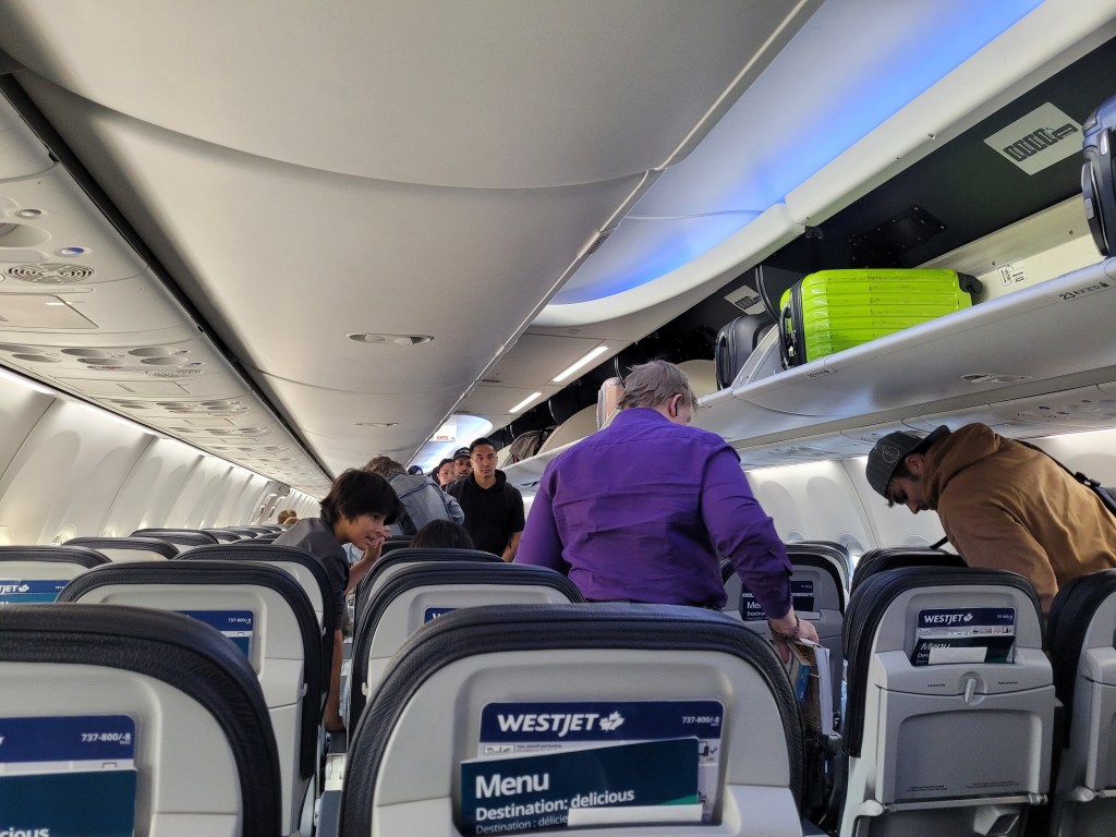 The clear winner in this category is Air Canada (AC). As you board, you’re greeted by 16 recliner-style business class seats, and 153 economy class seats for a total of 169 seats, the least dense of the 3 carriers. Black leather adorns the seats, equipped with seatback entertainment screens and fully adjustable headrests. The economy section is in your typical 3-3 configuration found on all carriers. At the front of the cabin, preferred seats are available for an extra fee that come with extra legroom and earlier deplaning. The overhead bins are very similar to WS, featuring Boeing’s Sky Interior with the larger bins, there’s even instructions to insert your roller bag and then flip it upright to get more bags in.
