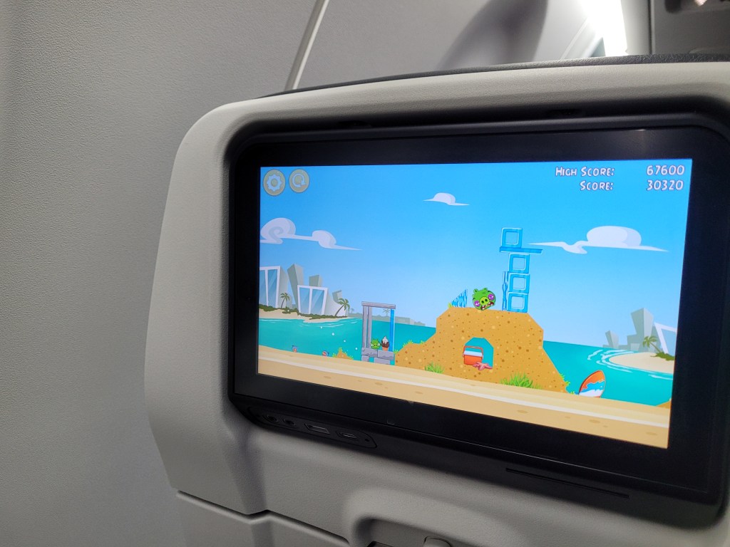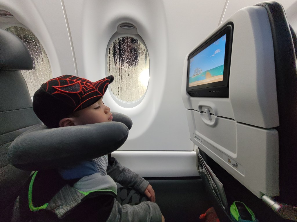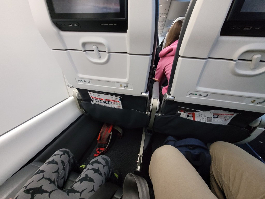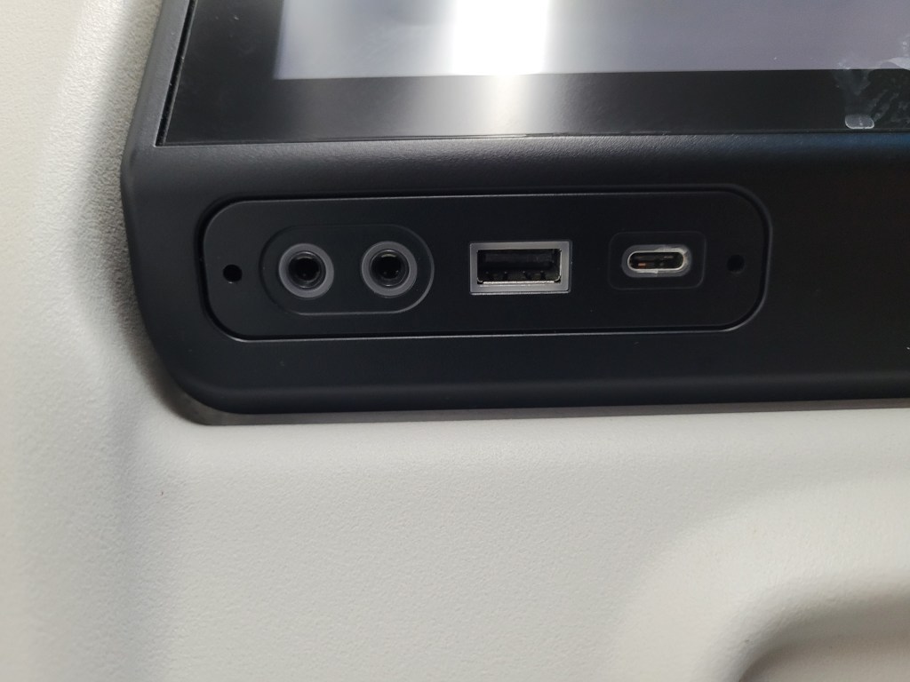 Jacob was with me for the first flight. We have to have the kids alternate who sits with who otherwise he’ll never give up sitting with mom. As we normally do, we had two rows of seats, which worked great with this seating configuration. It’s a bit randomly placed halfway down the plane, but rows 20 and 21 are non-exit row preferred seats, which offer more legroom, over 34 inches in our case. The A220 seats are among the widest in the industry with 18 inches of width. All seats come with seatback entertainment screens which were high-definition and highly responsive. Paired with the seatback entertainment is a USB-A and C, along with your headphone jack.