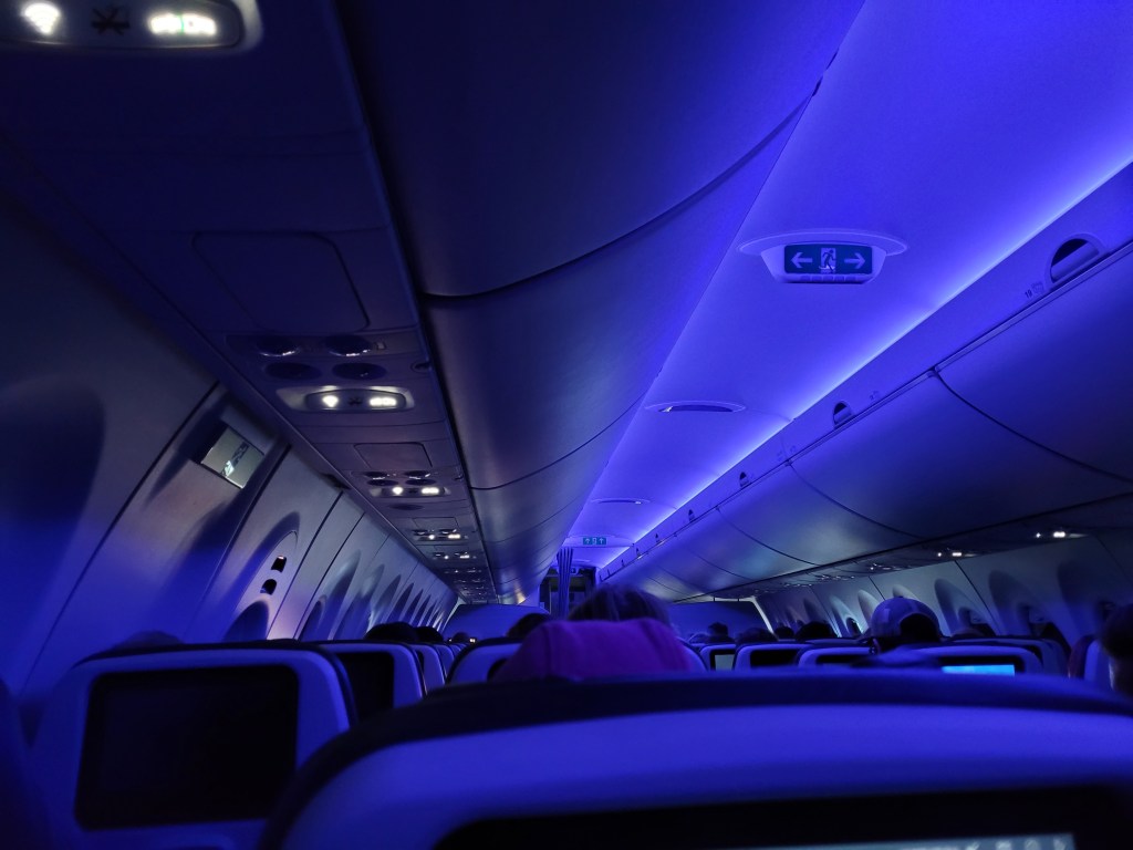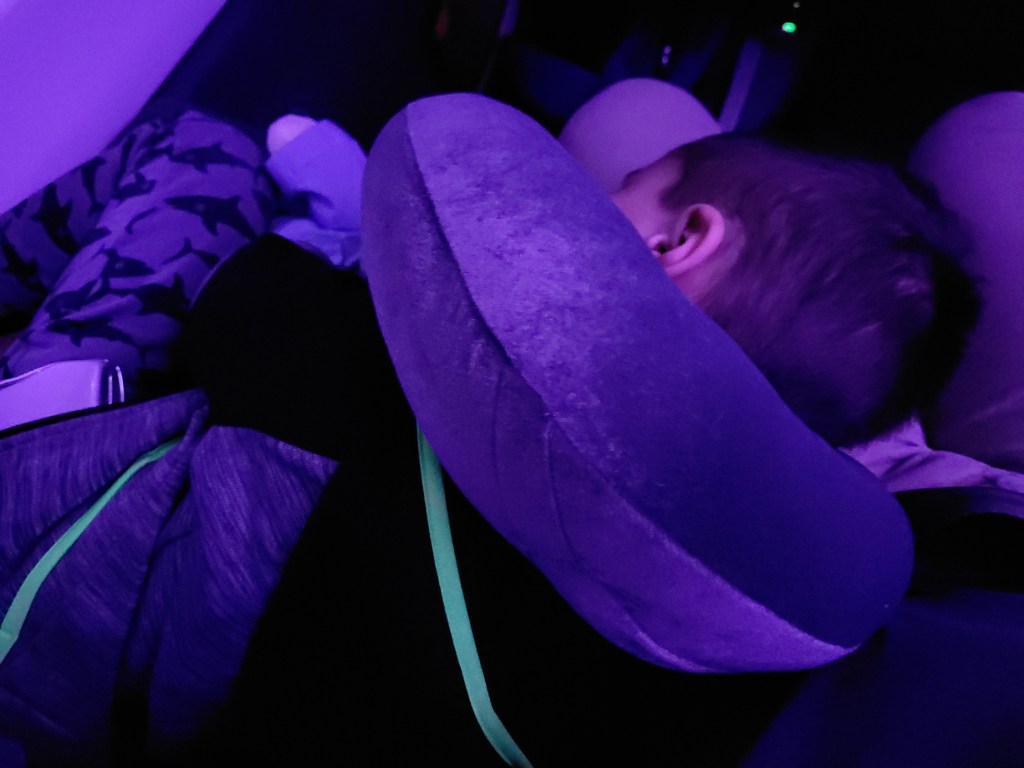 The lights were soon turned off for passengers to rest. However, and I commend the crew for their dedication to hydration, on this short 4.5 hour redeye flight, the crew came around twice offering water. Each time, they increased the cabin lighting in a deep blue colour, so while not overly disturbing, you’d definitely notice and wake up if you’re a light sleeper like me (of note though, Jacob slept through until landing).